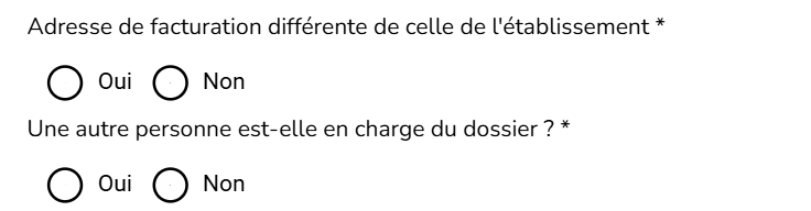 🔴ATTENTION : Merci de bien renseigner l’adresse de facturation. Si l’adresse de facturation est différente de l’établissement d’exercice du soignants, merci de cocher “oui” à la question ci-dessous. Vous pouvez également renseigner les coordonnées de la personne en charge du dossier.